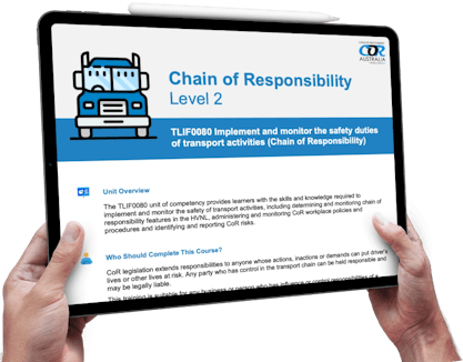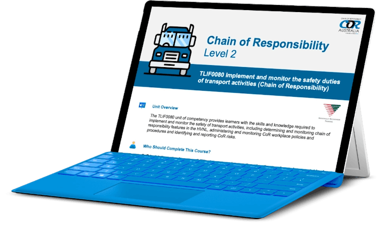 The TLIF0080 unit of competency provides learners with the skills and knowledge required to monitor the safety of transport activities, including determining and monitoring chain of responsibility features in the HVNL, administering and monitoring CoR workplace policies and procedures and identifying and reporting CoR risks.